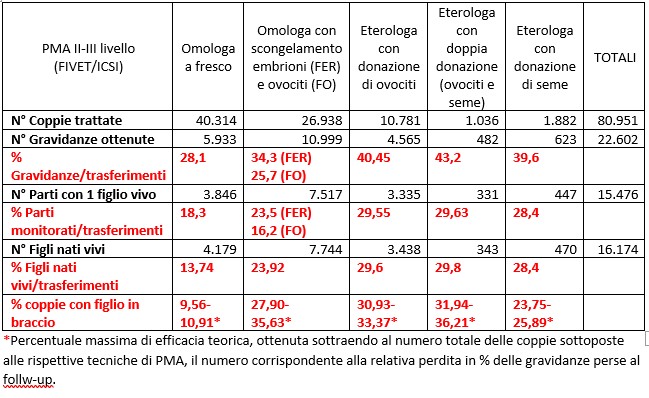 Da questi dati che non si discostano in modo significativo da quelli raccolti nelle Relazioni ministeriali degli ultimi anni, appare evidente la grande inefficacia delle tecniche dimostrata dalle basse percentuali di gravidanze prodotte in relazione al numero dei trasferimenti degli embrioni in utero; come pure delle ancora più basse percentuali di parti monitorati in relazione ai trasferimenti degli stessi embrioni. In generale, viene raggiunta una percentuale di possibilità concreta di avere almeno 1 “figlio in braccio” dal 10% al massimo 35% circa di tutte le coppie. Senza poi sottolineare che queste percentuali scendono al disotto del 10% nelle donne di 40-41 anni e inferiore al 5% nelle donne oltre questa età.